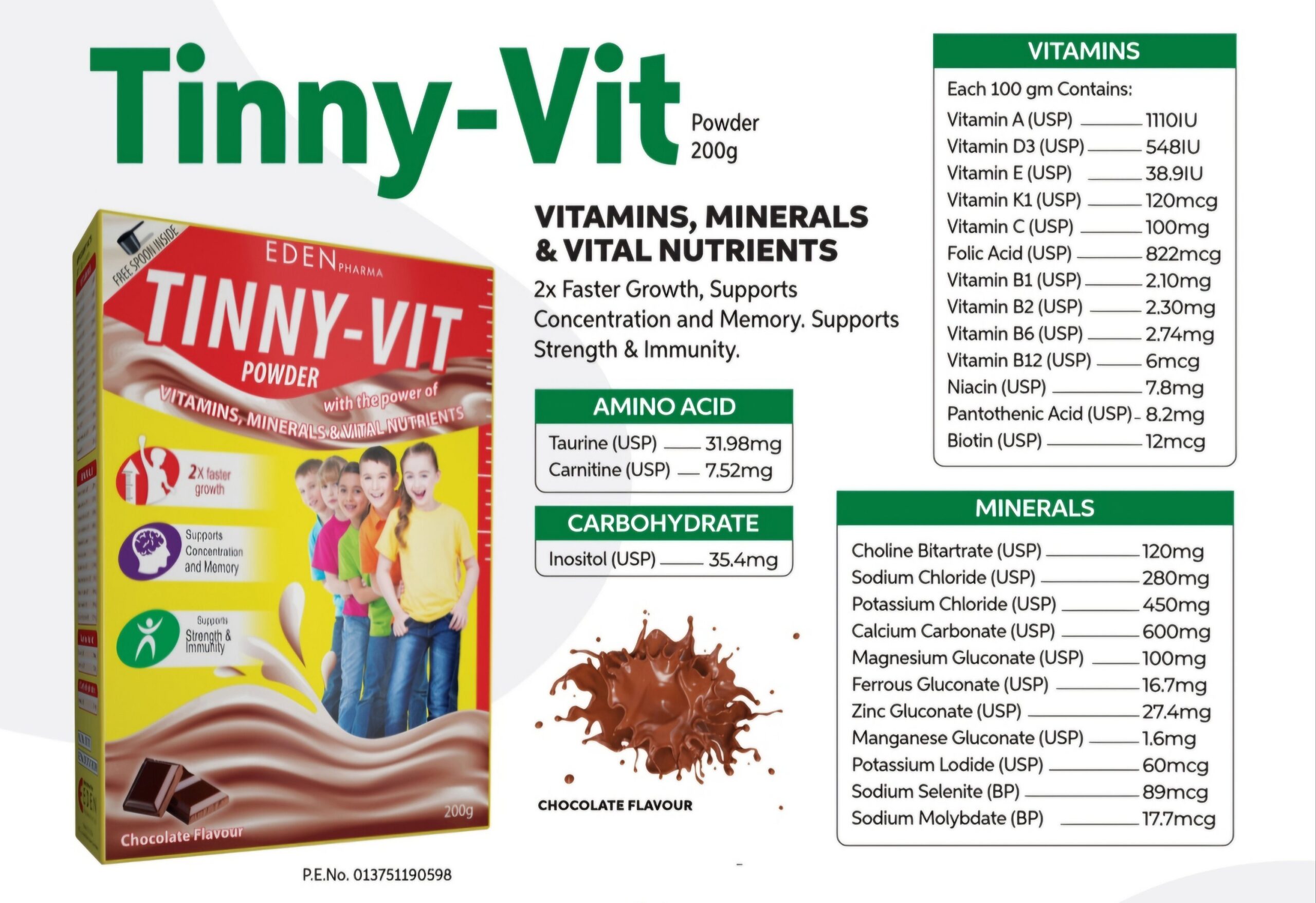 Tinny-Vit Powder is a premium quality nutritional supplement specially formulated to meet the daily vitamin and mineral requirements of children. It contains a balanced blend of essential vitamins, minerals, amino acids, and vital nutrients that support physical growth, mental development, and overall health.